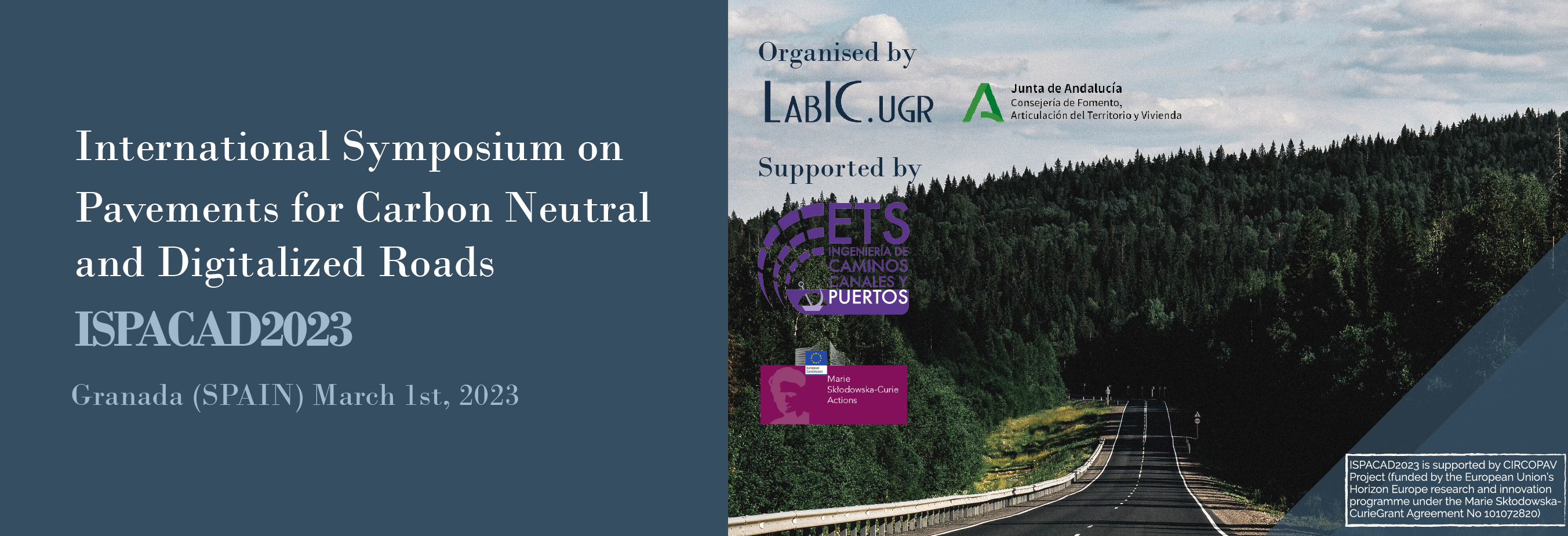 The International Symposium on Pavements for Carbon Neutral and Digitalized Roads (ISPACAD2023) is organised jointly by LabIC.UGR and Consejería de Fomento, Articulación del Territorio y Vivienda de la Junta de Andalucía.